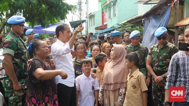 Presiden Joko Widodo (Jokowi) menyambangi Kampung Deret, di Jalan Tanah Tinggi I, Johar Baru, Jakarta Pusat. Jokowi bersama calon wakil presiden 01 Ma'ruf Amin akan memberikan pidato di hadapan warga, Selasa (21/5). (Foto: CNN Indonesia/Feri Agus Setyawan) |