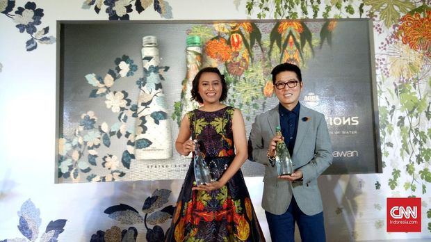 Sebastian Gunawan bersama Disa Lestari, Senior Brand Manager Aqua saat peluncuran desain botol terbaru di Ritz Carlton Hotel-Pacific Place, Jakarta Selatan, Rabu (31/1). (CNN Indonesia/Elise Dwi Ratnasari) |