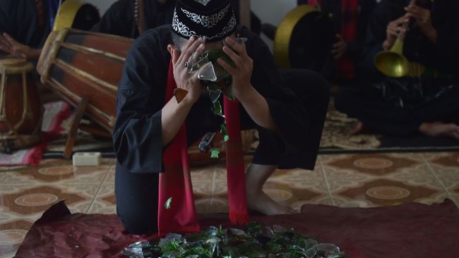 Tapi Mulyadi tak lantas menghentikan aksinya. Di tengah suara tetabuhan gendang dan suling, ia memakan paku yang ada berserakan di dalam baskom.