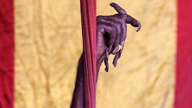 Tangah seorang Sadhu, orang suci dalam agama Hindu, yang tidaj memindahkan tangan dan memotong kukunya selama 10 tahun, tampak dalam "Kumbh Mela" atau Festival Kendi di Prayagraj yang sebelumnya dikenal sebagai Allahabad, India. (Reuters/Danish Siddiqui)